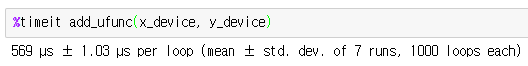 GPU에서 모든 데이터를 복사하는 오버헤드까지 포함하면 상당히 큰 향상입니다. 대규모 데이터 세트에서 특수 기능(exp, sin, cos 등)을 사용하는 Ufuncs는 GPU에서 특히 잘 실행됩니다.
