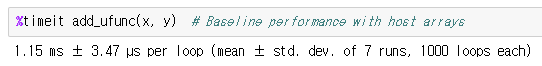 이 add_ufunc 호출은 호스트와 디바이스 간의 데이터 전송을 수반하지 않으므로 가장 빠르게 실행됩니다. 디바이스 어레이를 호스트 메모리로 되돌리고 싶을 때 copy_to_host() 메서드를 사용할 수 있습니다: