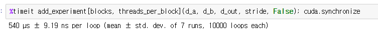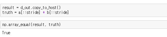 아래 셀에서 n을 정의하고 n과 동일한 스레드가 있는 그리드를 만듭니다. 또한 길이가 n인 출력 벡터를 만듭니다. Input 벡터로 stride * n 크기의 벡터를 생성합니다.