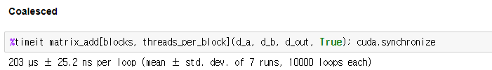 아래 코드를 실행해 커널 내 데이터 액세스 패턴에 대한 쪼끄만 변경이 성능에 미치는 영향에 대해 알아봅시다.