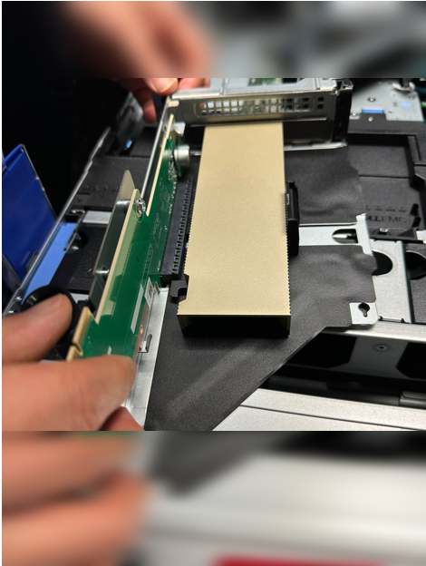 -서버에 보면 위 사진과 같이 라이저 카드가 있습니다. 라이저 카드중 PCIe 16lane을 갖고있는 Riser card의 나사를 풀어 Riser card를 분리해줍니다.