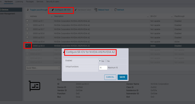 SR-IOV설정을 보면, Maximum 16이라고 나와있는데요. 16개까지만 분할이 가능하다는 것을 의미합니다. 저는 NVIDIA A2 GPU를 연결했고, A2 GPU는 16GB memory이므로, VM당 1GB까지의 분할이 가능하다는 것으 의미합니다.