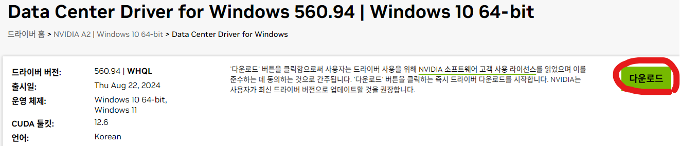 - VM에 GPU가 보이도록 하기위해 VM에 Graphic Driver를 설치해줍시다. 아래 링크에서 장착한 GPU에 맞는 드라이버와 버전을 검색한 뒤 드라이버를 다운로드 해줍시다.
