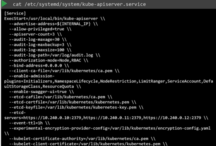 kubeadmin으로 셋업하지 않았다면, etc/systemd/system/kube-apiserver.service에 위치한 kube-apiserver 서비스를 왁인하여 옵션을 검사한다.