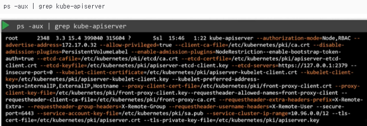 또한, 마스터 노드에 있는 프로세스를 리스트로 보여주고, kube-apiserver를 살펴봄으로써 실행중인 프로세스와 옵션들을 확인할 수 있다.