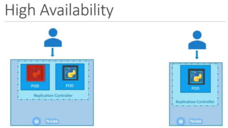 - Replication Controller는 클러스터의 여러 노드에 걸쳐있기 떄문에 여러 노드에서 POD와 애플리케이션의 로드 밸런싱에 도움이 된다,